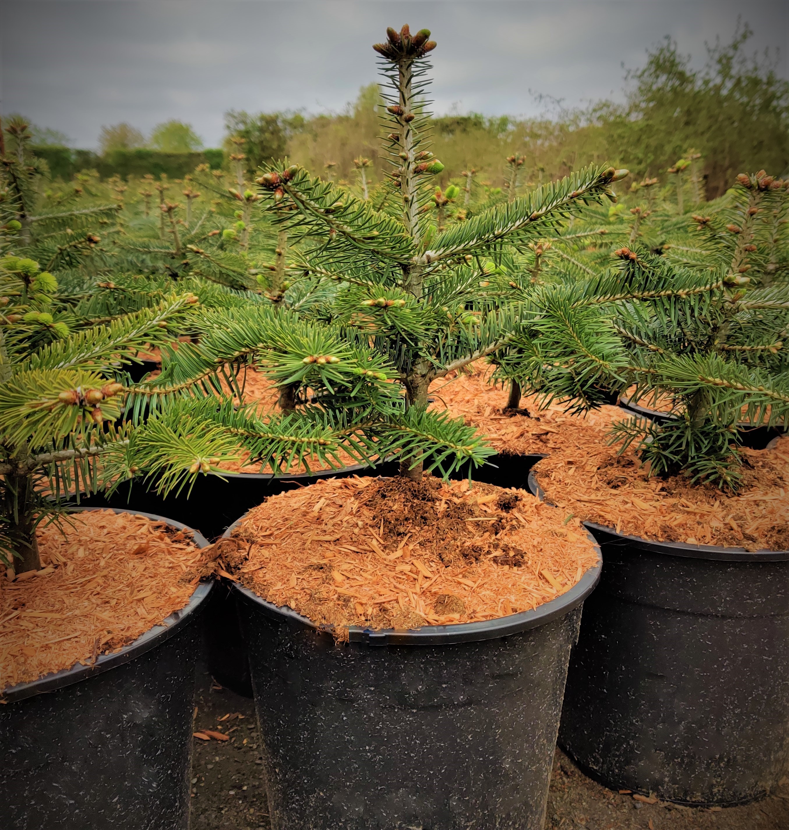 Foråret er den tid på året, hvor alting spirer frem og udvikler sig. Vi har netop pottet nye små juletræer, som skal vokse sig store. Ligesom vi har ompotte træer, så rødderne får mere plads i en endnu større potte, så træerne kan vokse sig store og flotte. Et godt og vitalt rodnet er forudsætningen for et flot træ og et træ der kan udplantes efter jul. Bemærk på billedet, at der ligger træflis på toppen af potten. Dette er for at undgå ukrudt og undgå brug af kemi til bekæmpelse af ukrudt.