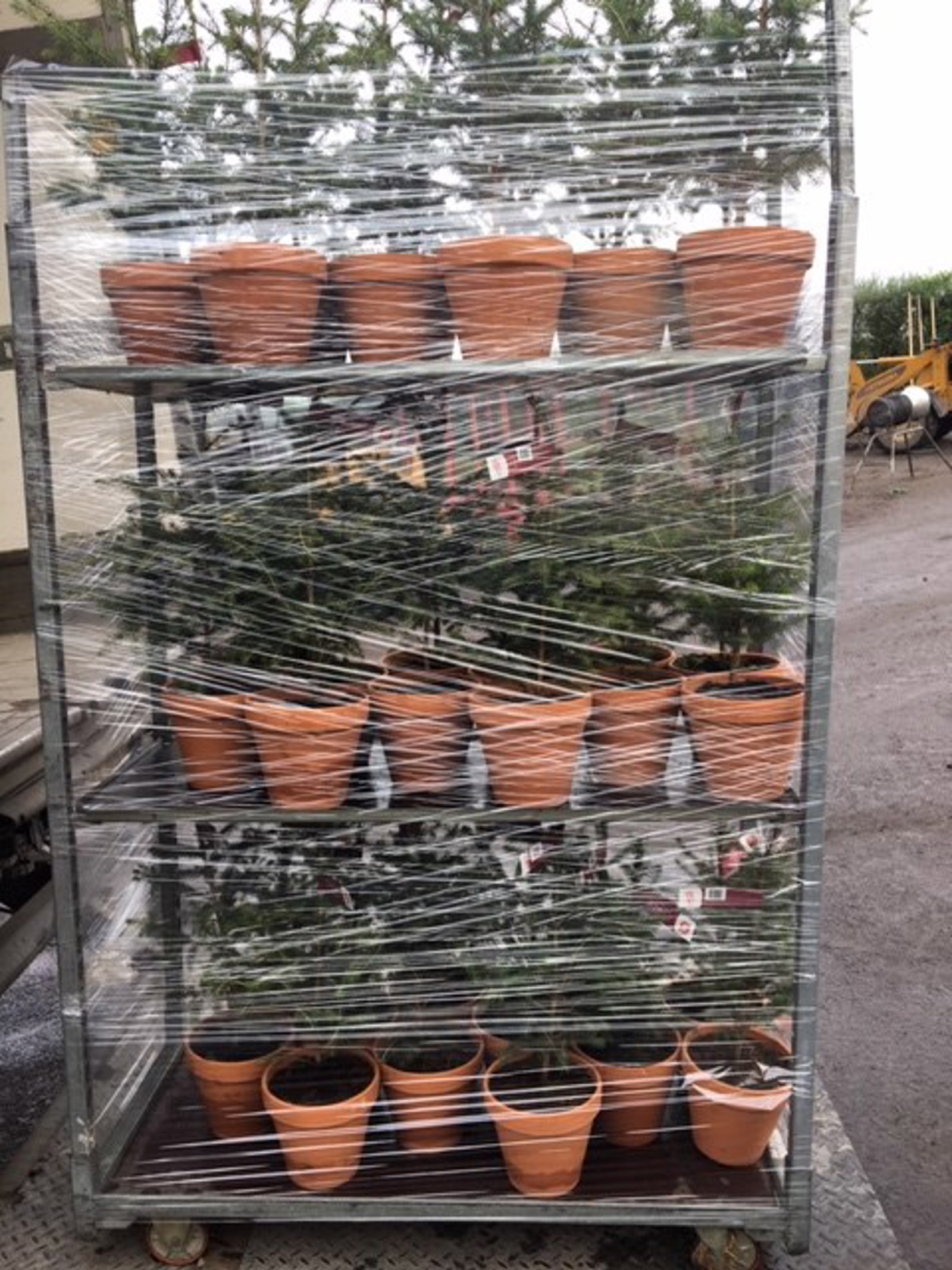 Træerne kan både blive pakket på cc-containere og paller. Se skemaerne nedenfor for at se hvor mange enten nordmannsgran eller rødgran der kan være på enten en cc-container eller på en palle.